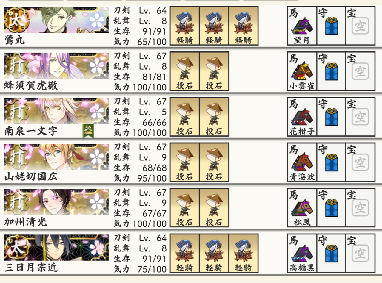 敵は強くないので育成のために極太刀2振りと極打刀(2スロ)4振りの組合せの部隊で周回しました。