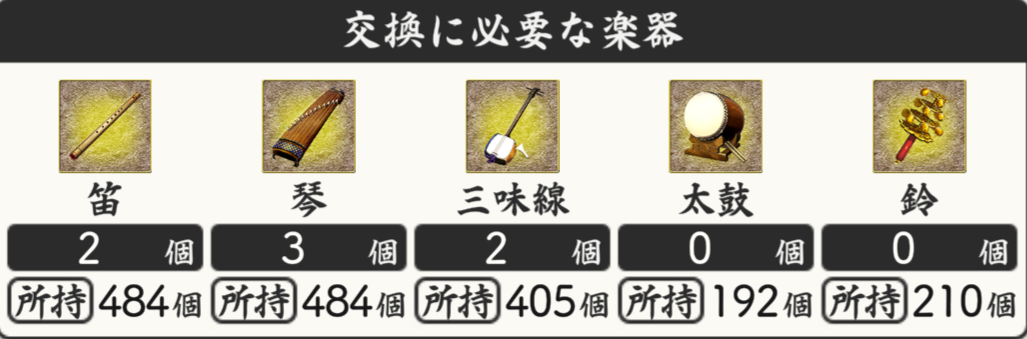 秘宝の里でたまりにたまった楽器を近侍曲にとり変えることを思いたちました。