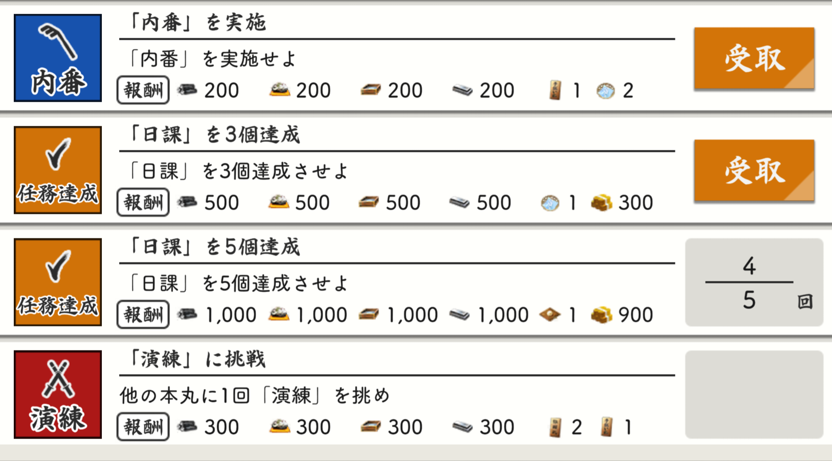 報酬が最高の「日課」を5個達成をクリアするためには「演練」をこなすのが必須になってしまいました。