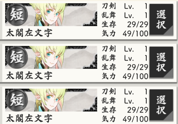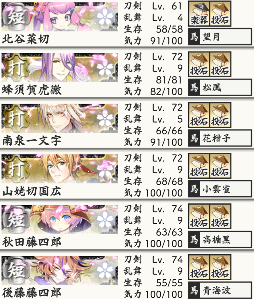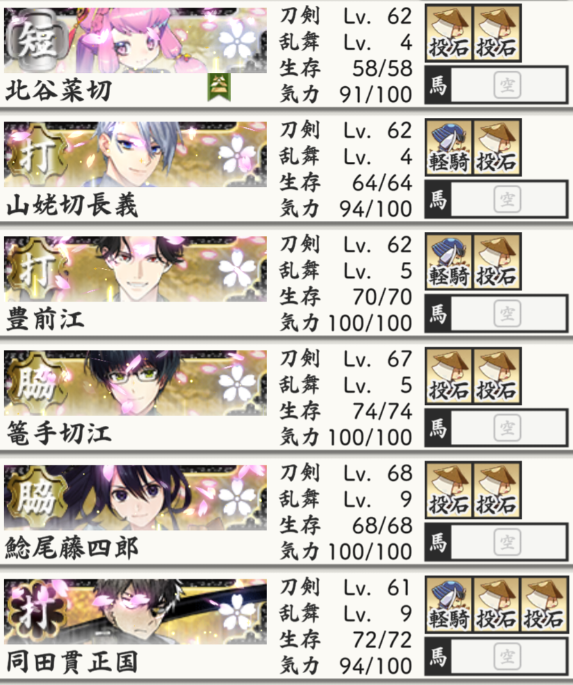 野戦なので、素直に短刀、打刀、脇差で編成。