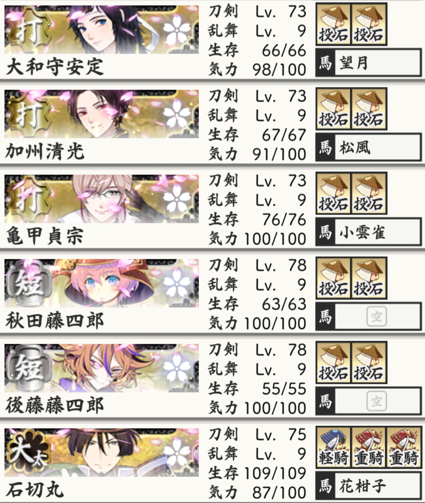 我が本丸は秘宝の里は遠戦重視の編成にしています。